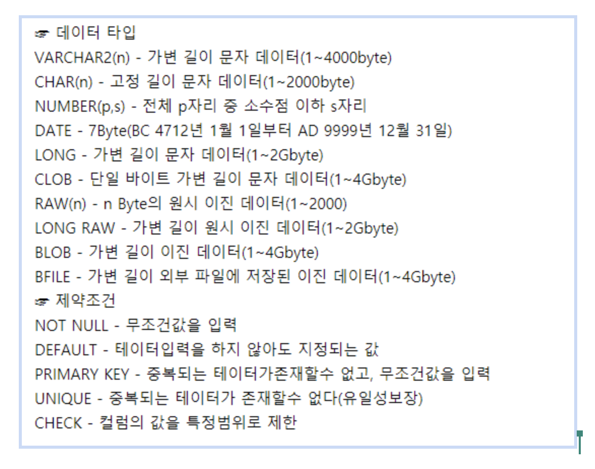 create table test(num number(5) primary key, name varchar2(20), score number(6,2), birth date);