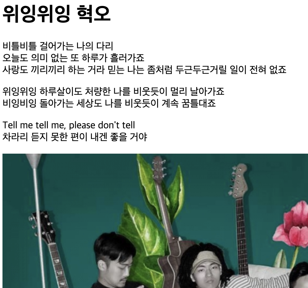 <h1>위잉위잉 혁오</h1> <p>비틀비틀 걸어가는 나의 다리<br> 오늘도 의미 없는 또 하루가 흘러가죠<br> 사랑도 끼리끼리 하는 거라 믿는 나는 좀처럼 두근두근거릴 일이 전혀 없죠</p>