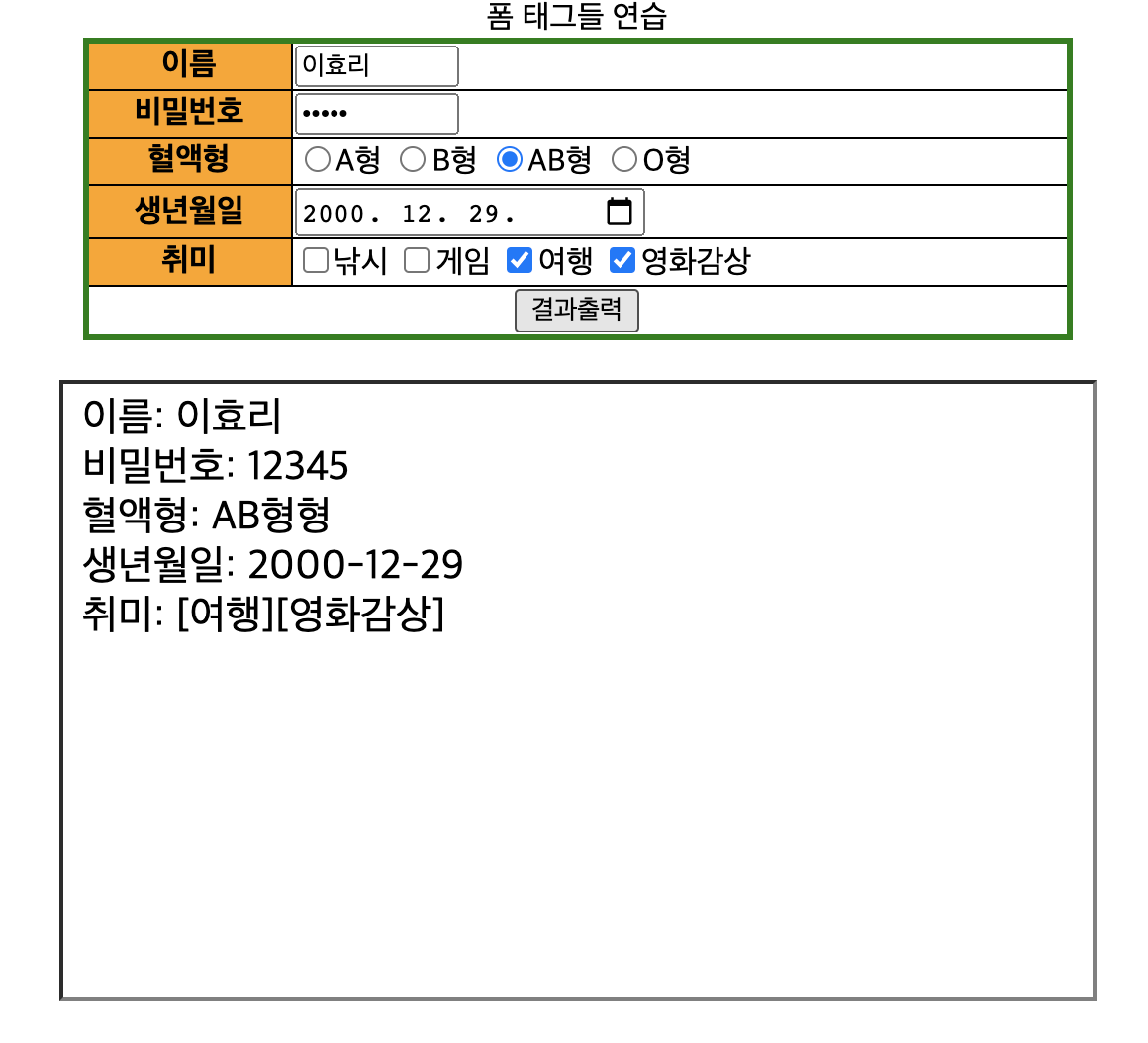 s+="혈액형: "+frm.blood.value+"형"+"<br>"; //form의 name으로 접근